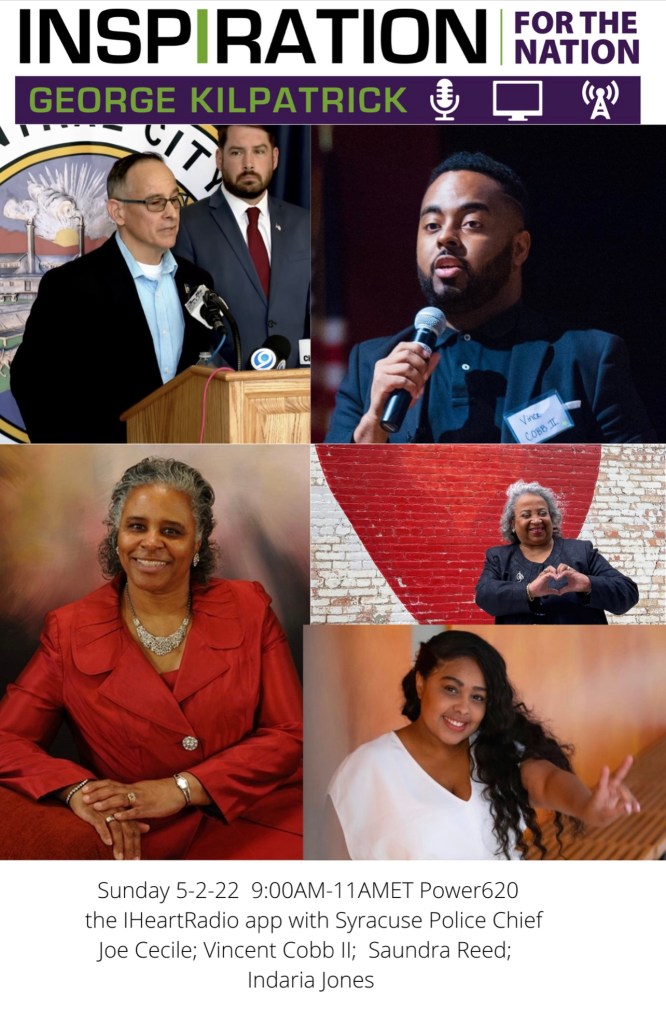 Join me Sunday morning 5/1/22 9 AM -11 AM EST for Inspiration for the Nation Syracuse Police Chief Joe Cecile shares his plan and vision for the city; it’s a Mother’s Day jam with Indaria Jones and Ready entertainment; There are money moves you need to know with Vicki Brackens; and looking to train the next generation of black male teachers with Vincent Cobb II and Saundra Reed. Join me Sunday morning 9 AM to 11 A ET on Power620 and the iHeart radio app.
